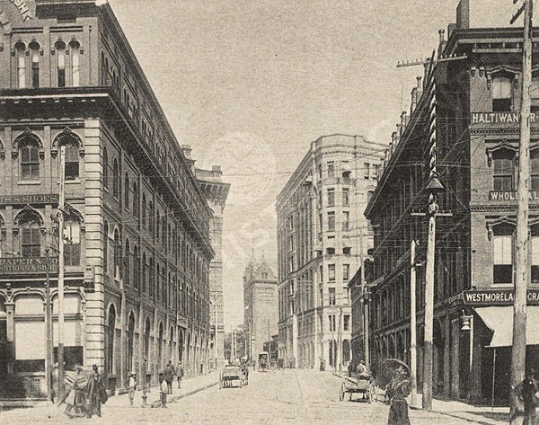 Equitable was completed in 1892, and you can clearly see it in the birds eye drawing from the same year below (11 is Equitable, 12 is YMCA). The main floor had 24 granite columns that wrapped around it, with the upper stories composed of light brick and terra cotta. It stood at about 105 feet tall and had four steam-powered elevators.